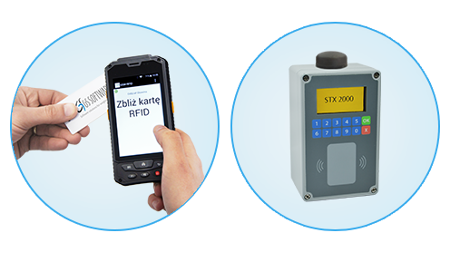Das Fahrzeug fährt zum vorgesehenen Entladeplatz. Am Ort der Entladung befindet sich ein STX-2000 Leser mit GPRS-Modul. Nach dem Entladen ruft der Fahrer die RFID-Karte am Terminal ab. Informationen über den Zeitpunkt und den Ort der Entladung werden per Modem an die zentrale Datenbank gesendet. An Orten, an denen die Entladungen von einem Menschen gesteuert werden, besteht die Möglichkeit, ein Mobiltelefon mit einem RFID-Kartenleser (anstelle eines STX 2000-Lesers) zu verwenden. Nach der Ankunft am Entladeort ruft der Fahrer die Karte am Telefon ab und Informationen über Zeit, Position und Nummer der Karte werden an die zentrale Datenbank gesendet.