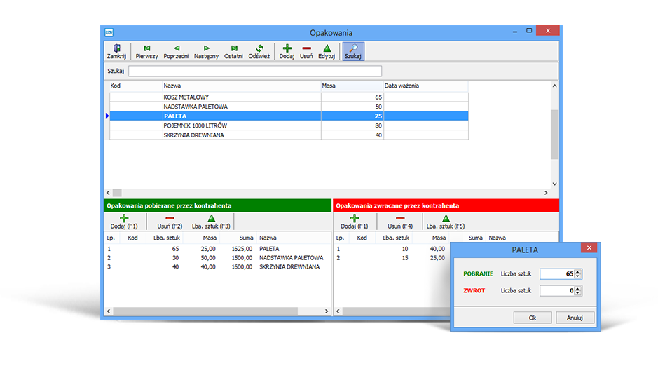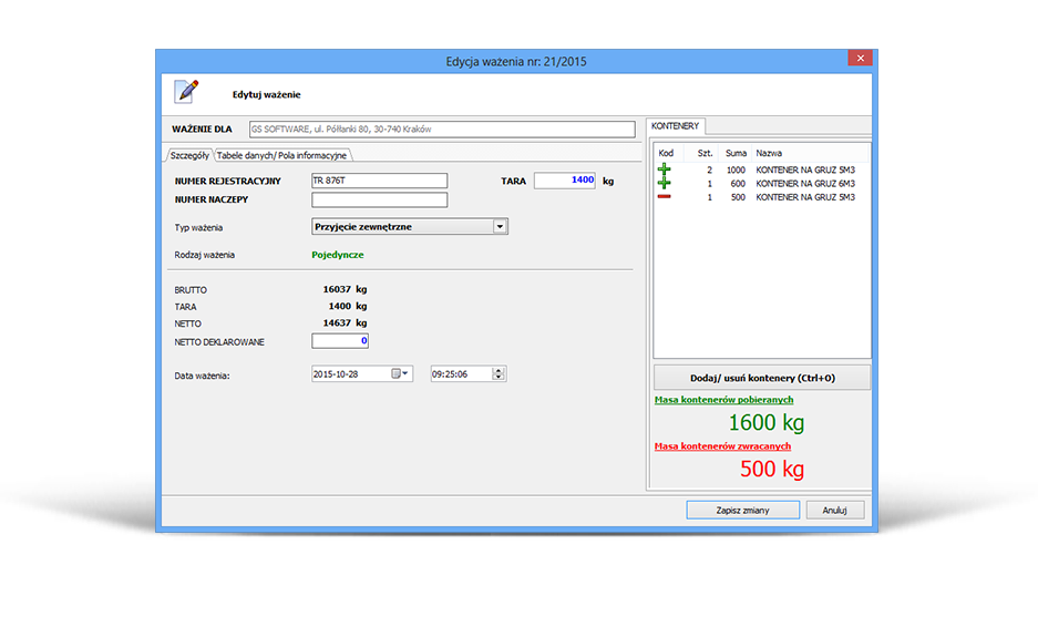 Die Wägung mit Containern funktioniert ähnlich wie die Wägung mit anderen Verpackungsarten. Der Benutzer kann das Gewicht der mitgenommen / zurückgebrachten Container und deren Art bestimmen. Die eingegebenen Daten sind in der Aufstellung der Wägungen und auf dem Wiegeschein sichtbar.