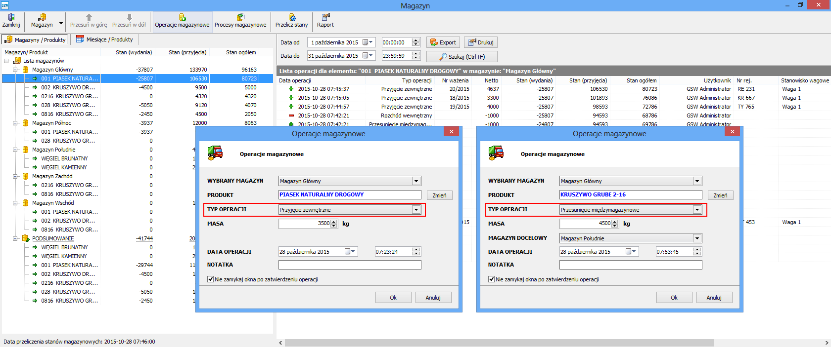 Das GSW-Programm ermöglicht es, Wägungen durchzuführen und gleichzeitig das Lager zu verwalten. Abhängig von der Art der durchgeführten Wägung kann der gewogene Artikel gleichzeitig im Lager aufgenommen, von Lager ausgegeben oder zwischen bestimmten Lagern umgebucht werden. Die ausgeführten Operationen sind in der Liste von Operationen des gegebenen Lagers ersichtlich. Auf der Liste der Wägungen ist hingegen lediglich die Bezeichnung des Lagers, für den die Wägung durchgeführt wurde und dem die Waren zugeordnet wurden, sichtbar.