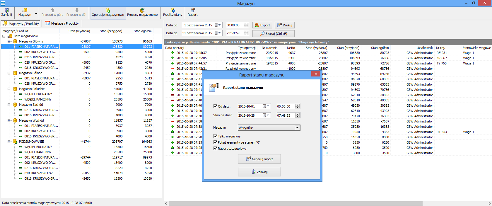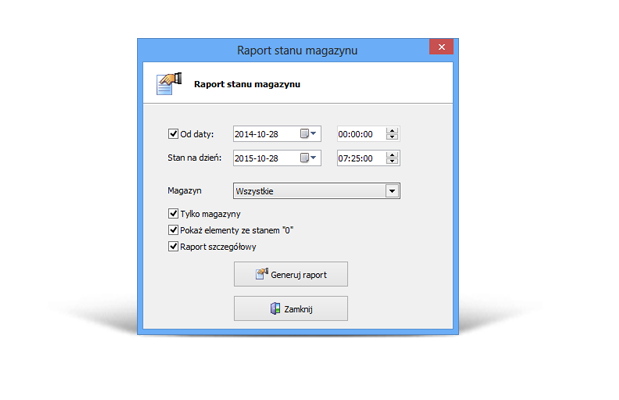 Das Lagerverwaltungsmodul wurde ebenfalls mit der Funktionalität ausgestattet, Berichte über den Bestand von Artikeln zu erstellen. Die Berichte können sich entweder auf sämtliche Lager oder auf ein ausgewähltes Lager beziehen. Der Benutzer kann die genauen Parameter der generierten Berichte bestimmen.