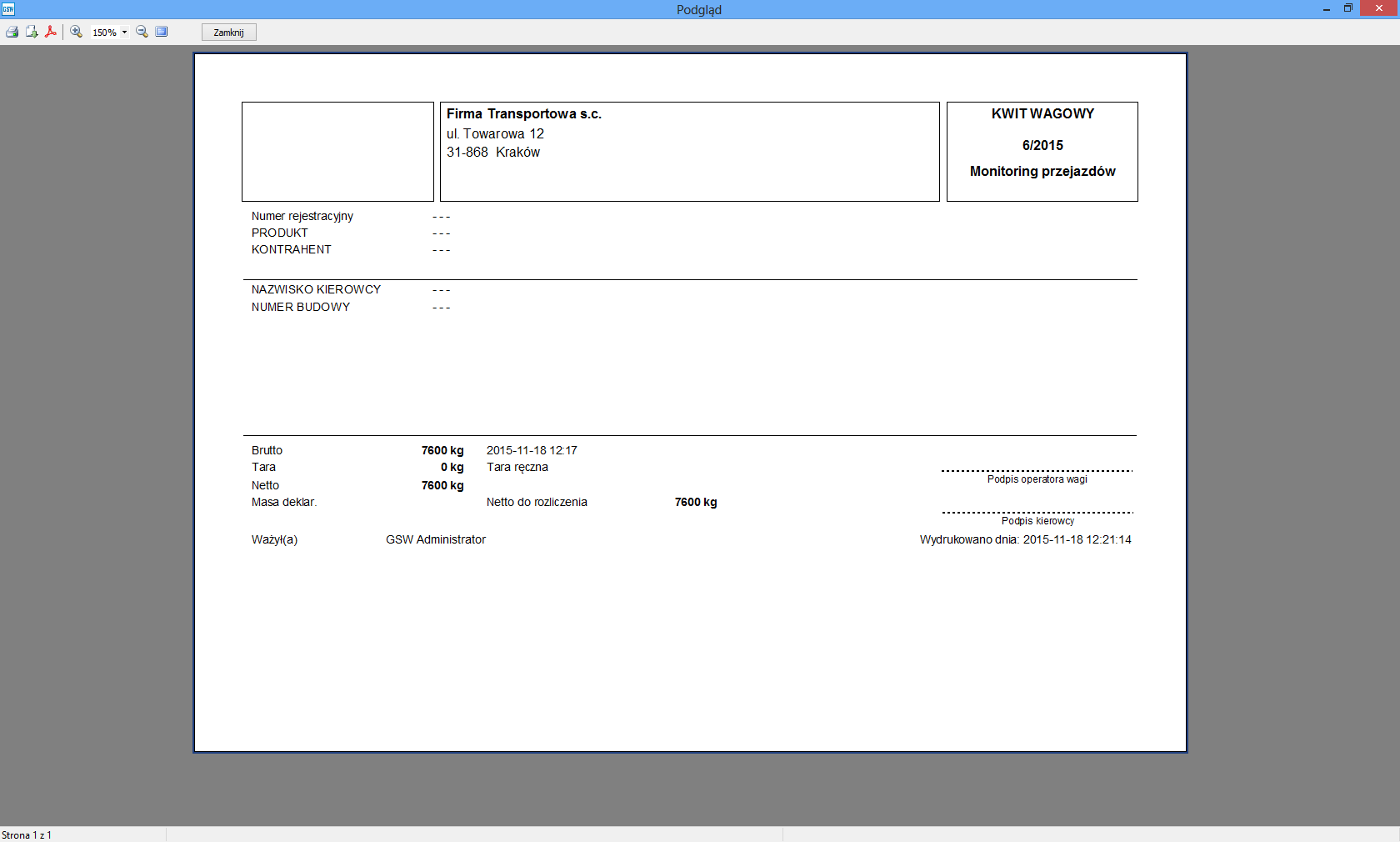 RSD ist ein universelles Gerät zur Erfassung von Daten, die über serielle Schnittstelle RS2323 übertragen werden. Das Gerät verfügt über einige Betriebsarten. Eine davon ist die Überwachung der Durchfahrten über die Fahrzeugwaage. In diesem Modus zeichnet das RSD-Gerät auf, wenn ein über die angegebene Last hinausgehende Gewicht (z. B. 400 kg) auf der Waage festgestellt wird. Das Registriergerät zeichnet den maximalen, stabilen Wert des Gewichts oder, wenn kein stabiler Wert bis zur Runterfahrt von der Waage vorhanden war, den maximalen unstabilen Wert des Gewichts auf. Das Registriergerät kann das Relais für einen bestimmten Zeitraum nach Ersterfassung des über die angegebene Last hinausgehenden Gewichts steuern. Das Gerät kann darüber hinaus direkt an den Auswertegerät angeschlossen werden.