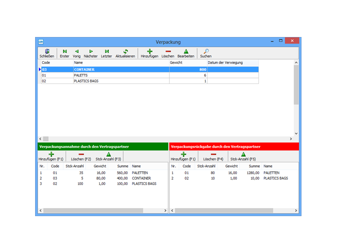 In dem Programm gibt es es die Möglichkeit, die Verpackungsliste zu definieren, zusammen mit den, ihnen zugeordneten Gewichtswerten. Auf der Wiegemaske befindet sich ein zusätzliches leeres Feld, in dem der Benutzer bestimmt, wie viele Verpackungseinheiten zurückgegeben und wie viele abgenommen werden.