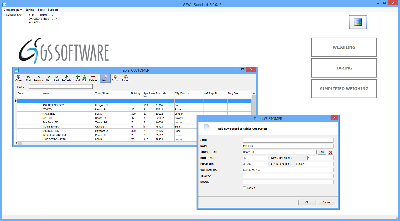 Den Firmen aus der Wiegeindustrie, die die Software für den weiteren Abverkauf beschaffen, wird im Kaufpreis des Programms angeboten, Ihr Logo und Anschrift auf der Hauptmaske einzubringen. Damit die Daten im Programm gespeichert werden , soll uns nach der Bestellung die Datei mit den Informationen (z.B. Firmenname, Adresse, Telefonnummer) geschickt werden.