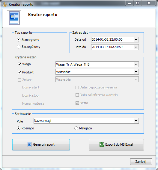 Die Berichte sind eine starke Seite des X-Scale Belt Programms. Das Programm hat einen Berichtsgenerator, mit der die Vorbereitung der allgemeinen und detaillierten Berichte, mit der Verteilung auf Waagen, Schichten und Produkte, möglich ist. Die Berichtsergebnisse können in der Datei im PDF oder MS Excel Format gespeichert werden.