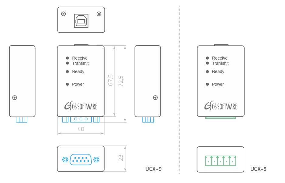 The UCX-series converters handle communication in the following standards: RS232 (Rx,Tx, GND lines) and RS485 2W. To ensure a proper operation in a given standard, one needs but to properly connect wires to a screw-type terminal or to a D-Sub connector.