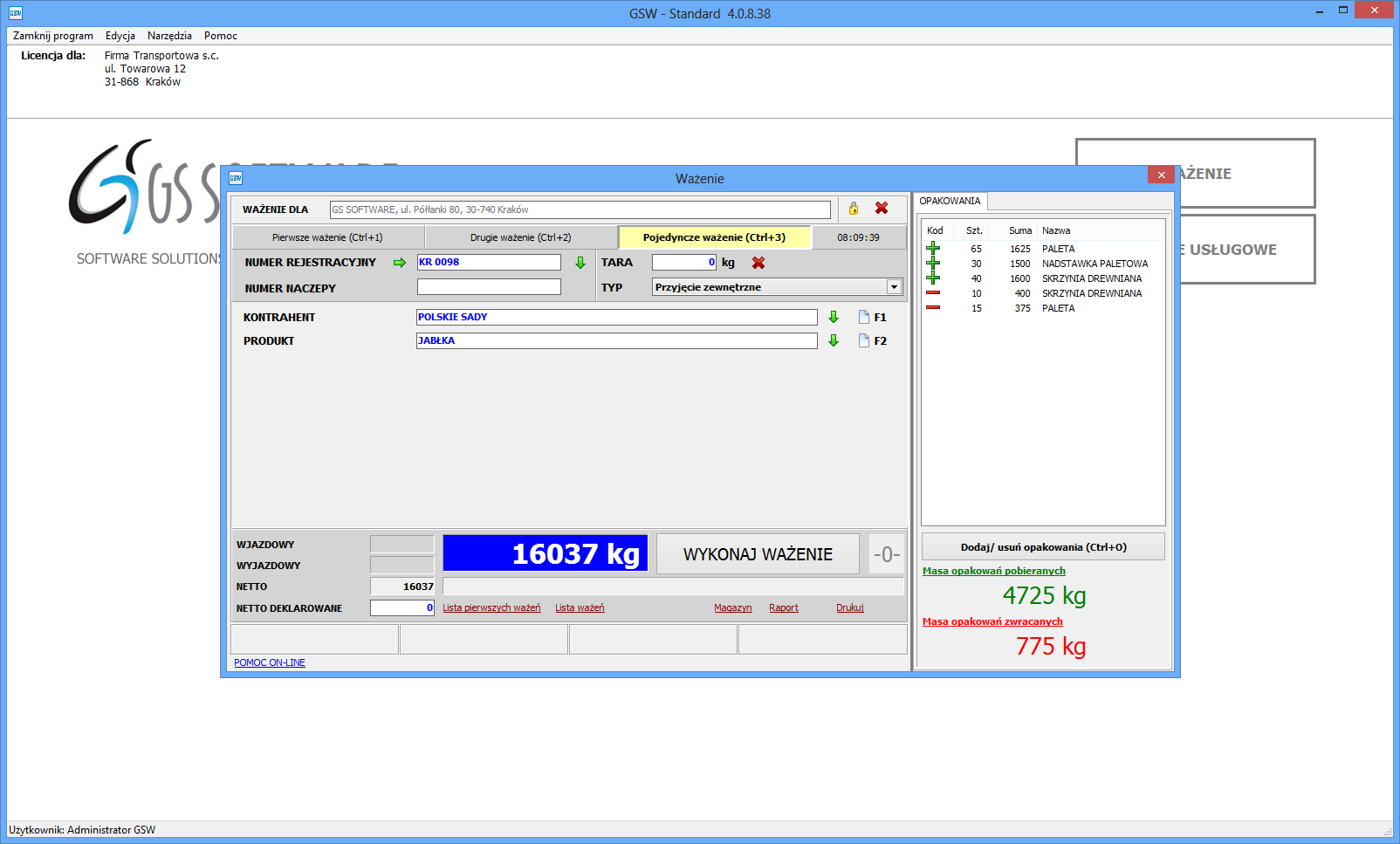 In the GSW program the user can determine, at his discretion, a type of received / released packaging, depending on the company’s profile of its business activity. The packaging includes as follows: pallet, wooden crates, metal hoppers, pallet collars, plastic packaging or containers. To each of the defined packaging the user can assign the weight of the said packaging.