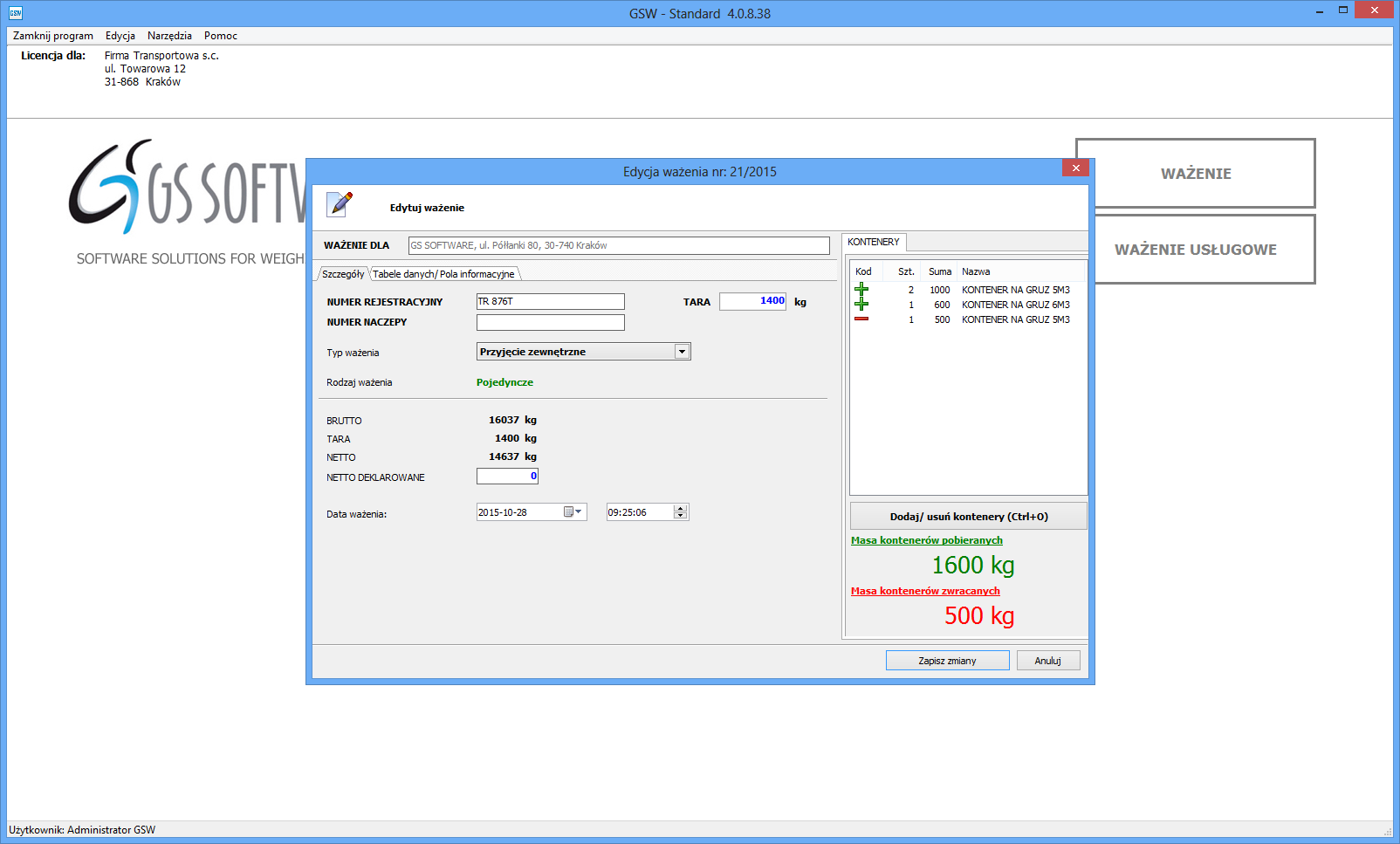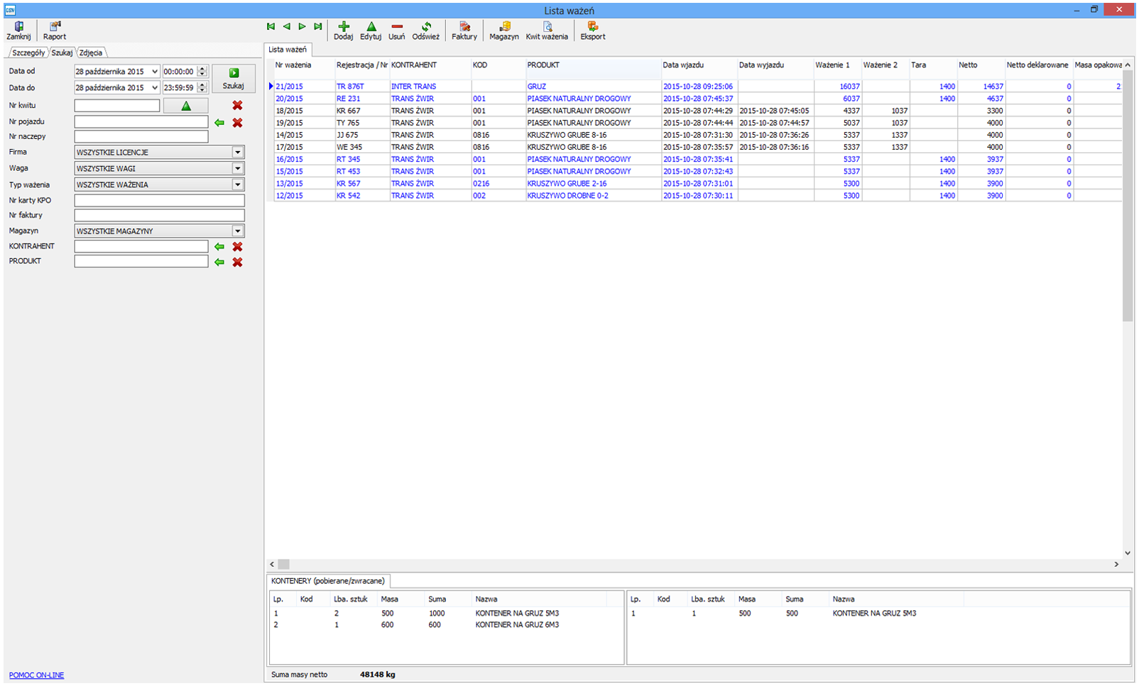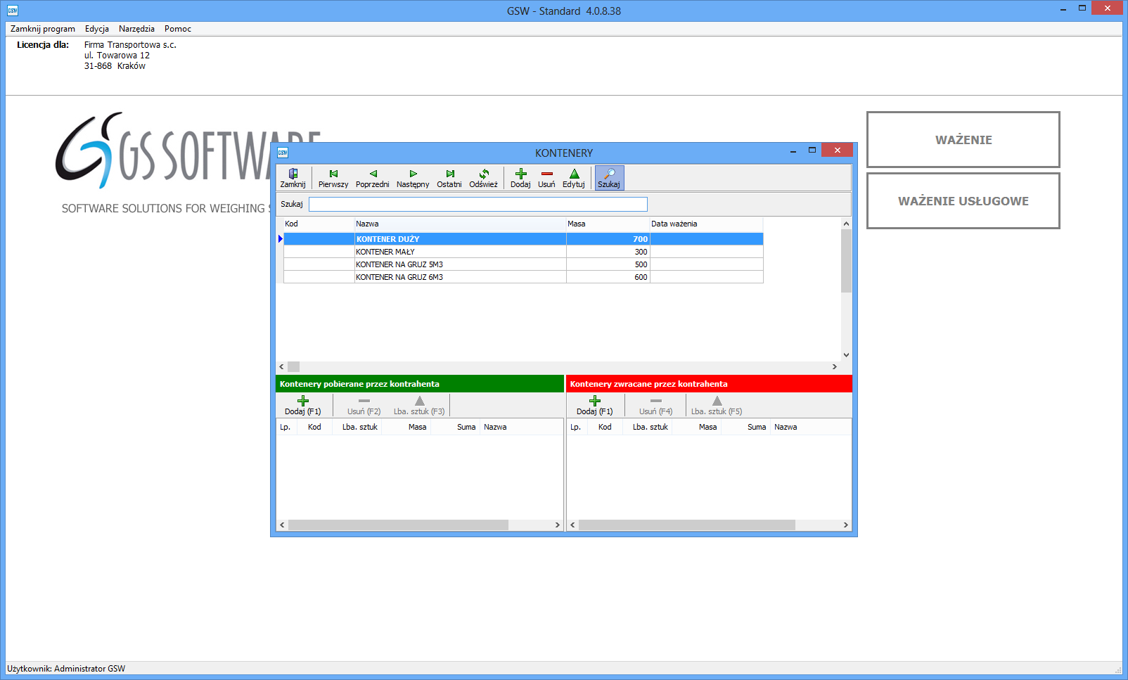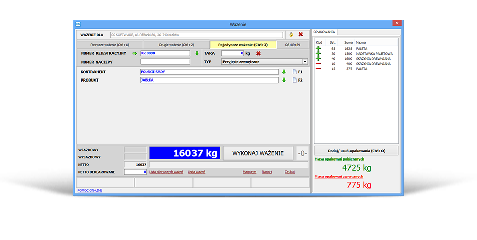 Weighing of materials in containers runs similarly to the weighing processes with various types of packaging. The user can determine the weight of collected/returned containers and their types. The entered data are displayed on the weighing list and weighing ticket. The entered data can be edited.