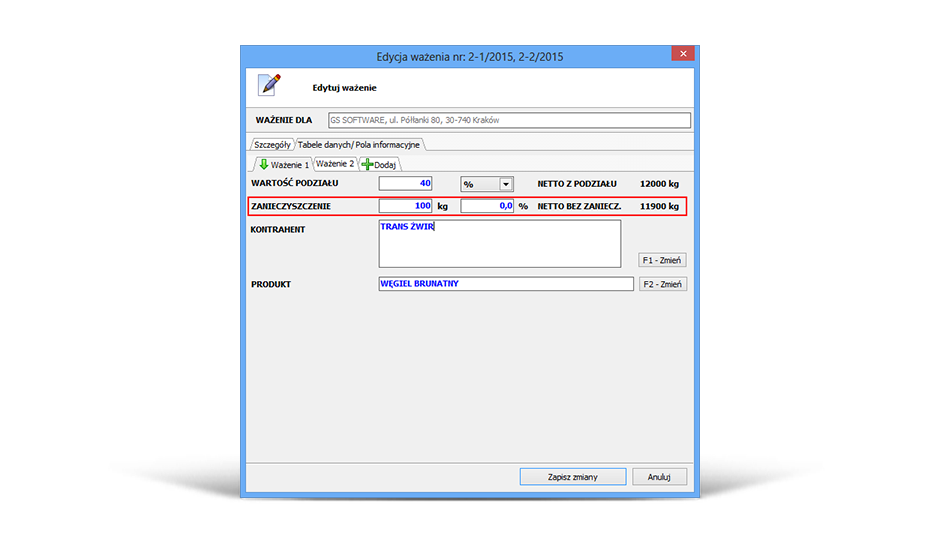 The GSW program has a module for handling contaminations of products. Before the weighing operation is performed, the user can enter the value of the contaminations. The contamination value can be expressed in kilograms or percent– the program automatically calculates the net weight, which is to be diminished by the contaminations value.