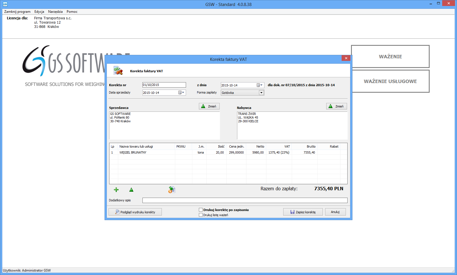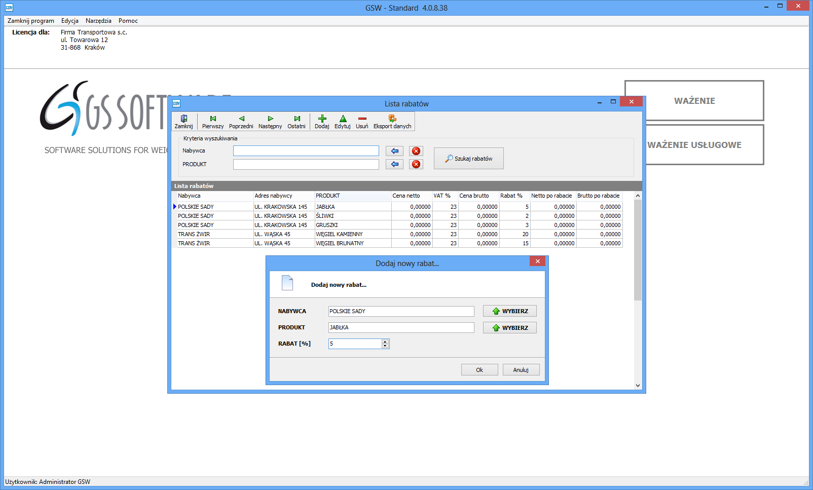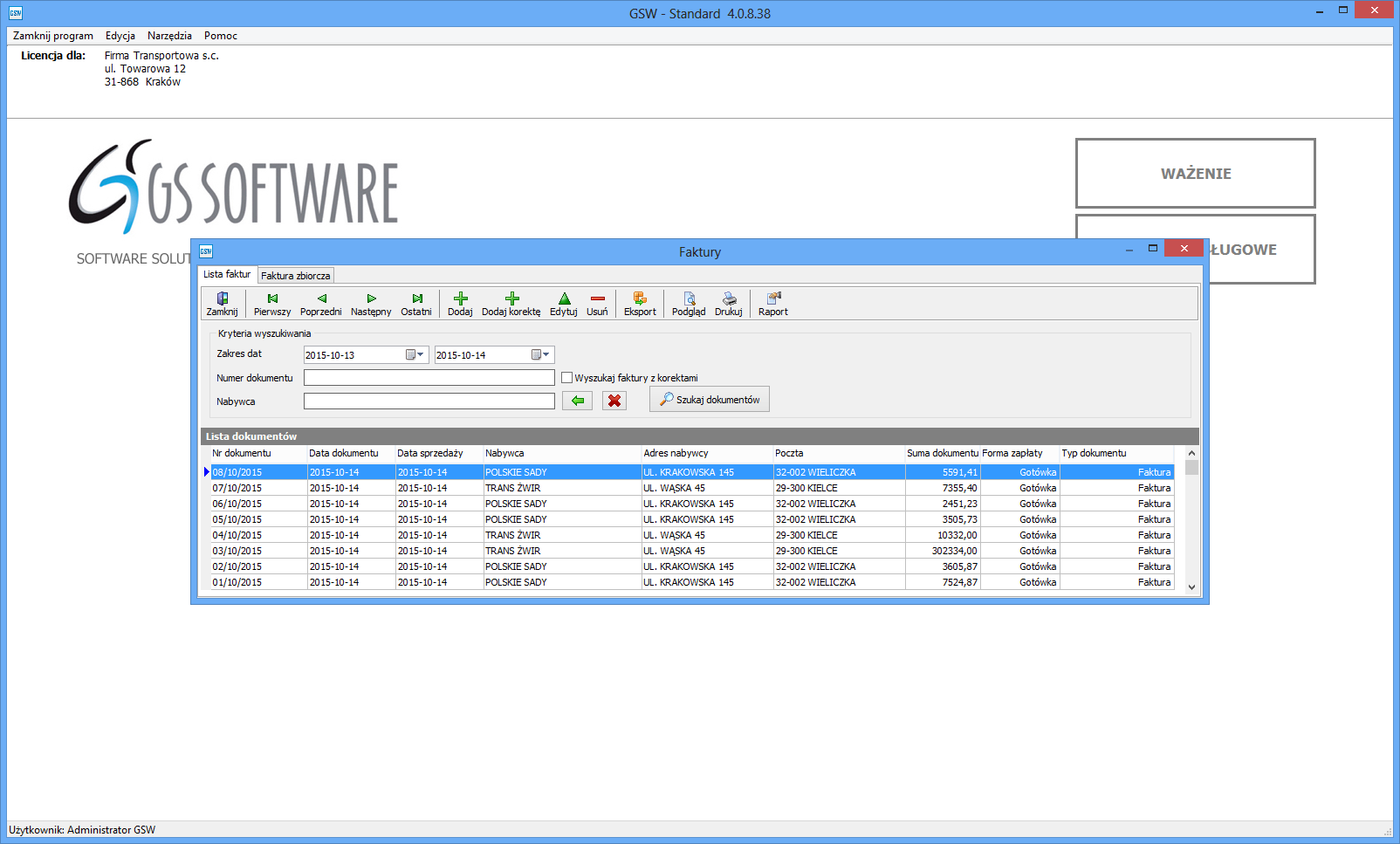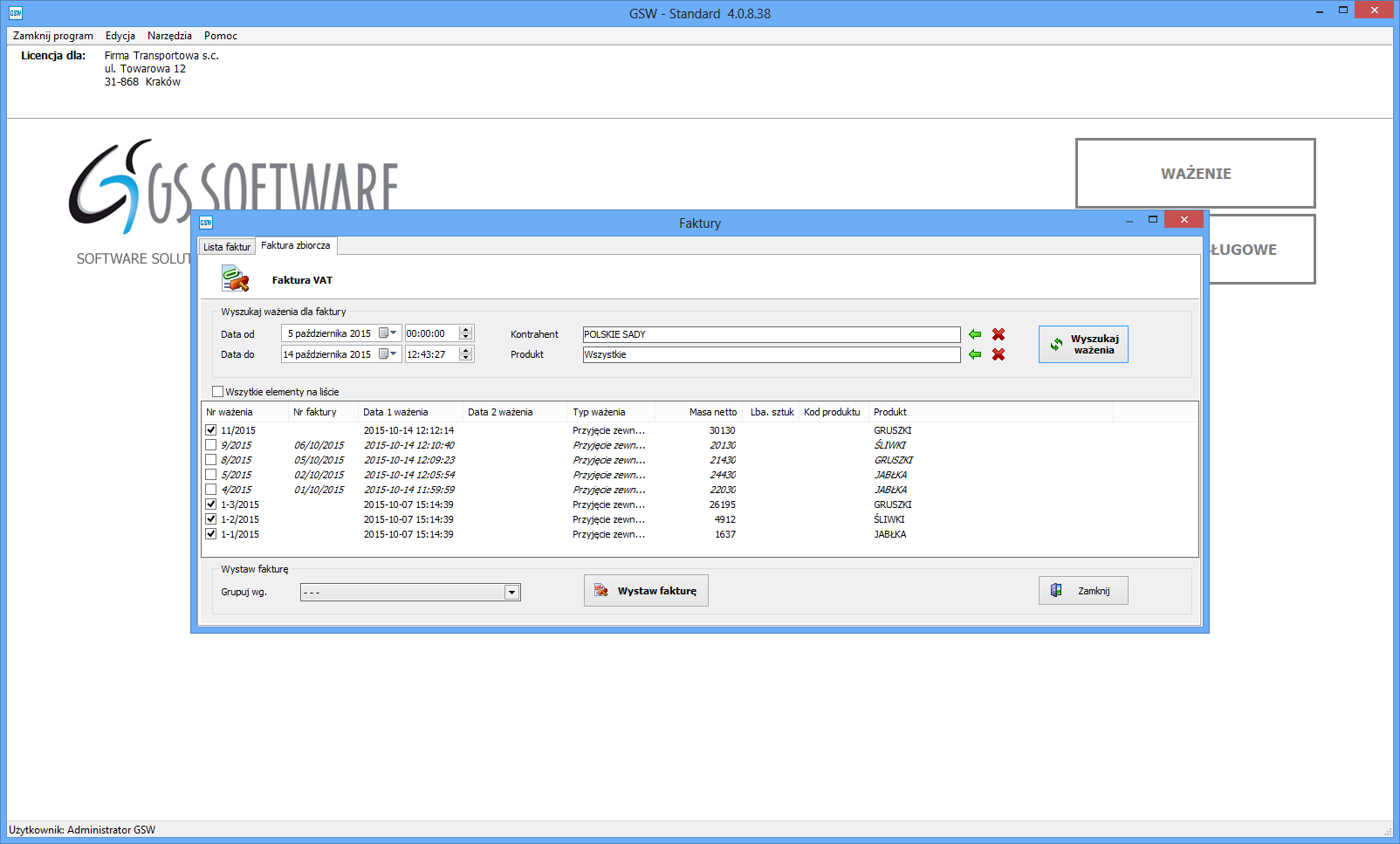 The GSW program can be equipped with an additional module to handle invoices. The module allows to issue a VAT invoice shortly after a completed weighing operation. While issuing the invoice, one can take into account, among others, discounts allocated to a given business partner or product.