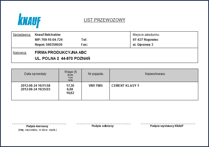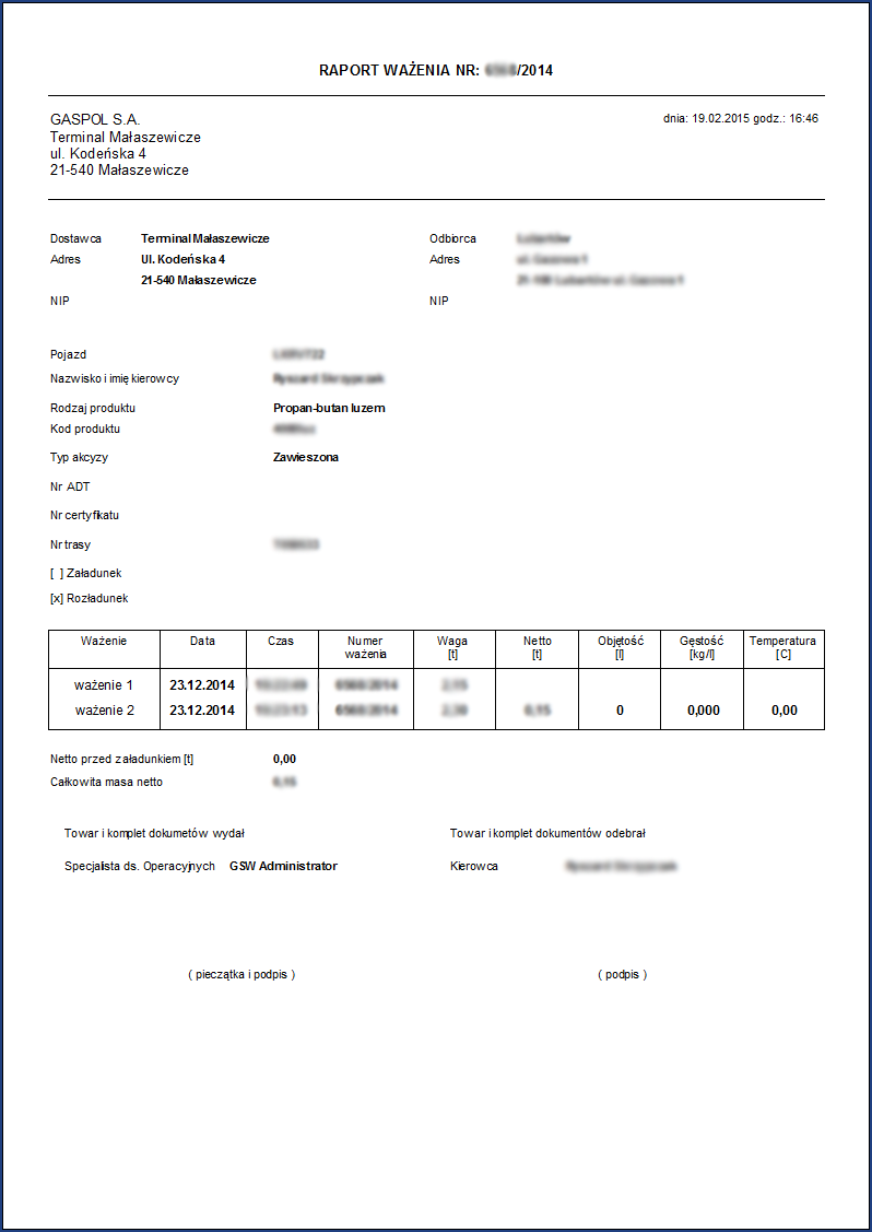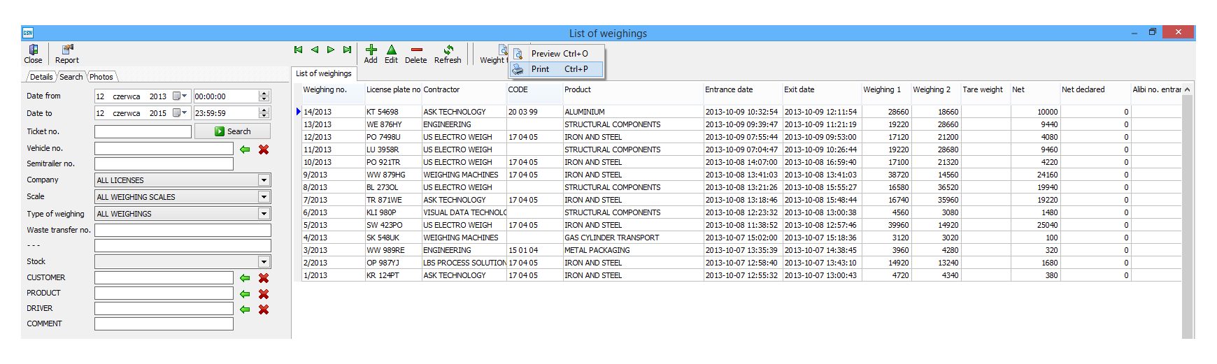 From the level of the weighing list and the window of first weighing operations, there is a possibility to view and print a weighing ticket. Tickets may be exported to the following formats: PDF, Ms Excel and JPEG.