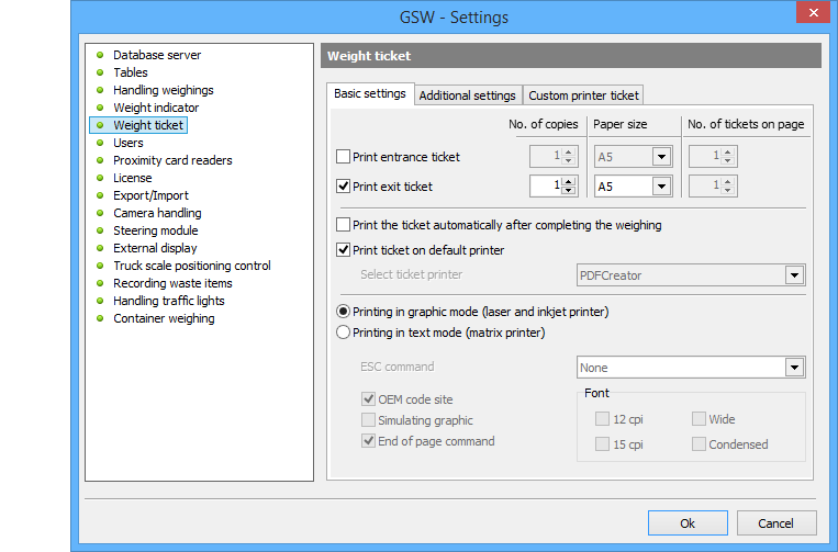 The GSW program allows to print weighing tickets in a graphics form (by means of laser and ink printers) and in a text form (by means of dot-matrix printers).