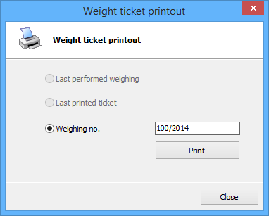 The GSW program is equipped with a quick print function, available from the weighing operation window and from the menu on the main form of the program. The function allows to print a weighing ticket without searching for it on the weighing operation list.