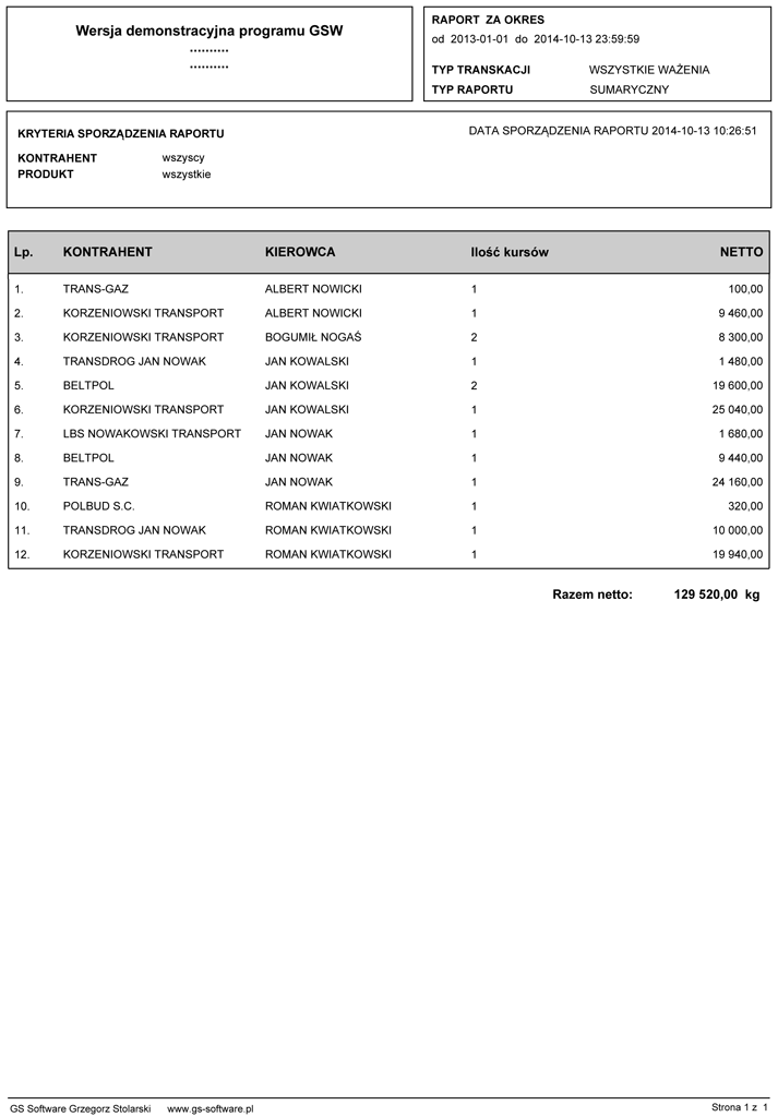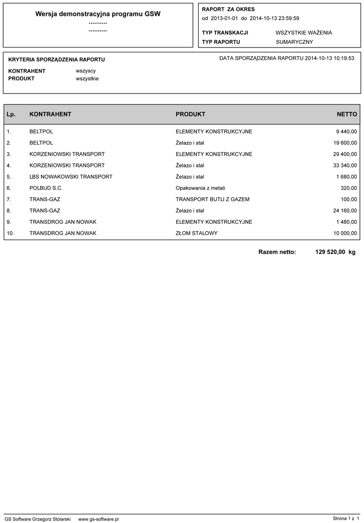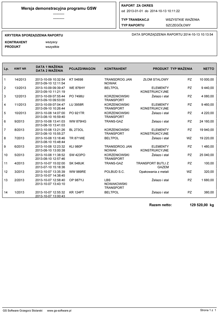 The GSW software contains a mechanism that allows to save report templates. Owing to that, the user does not have to define at any time the same searching criteria for weighing operations – all he/she has to do is to select a template from the list. Report templates are particularly useful when, e.g. it is necessary to periodically send a given report to a specific client – the only thing you have to do while selecting a template is to define date brackets (from – to).