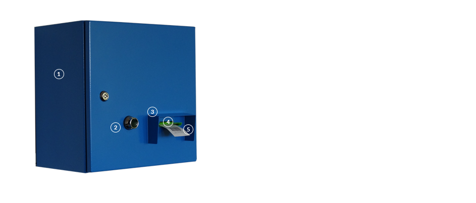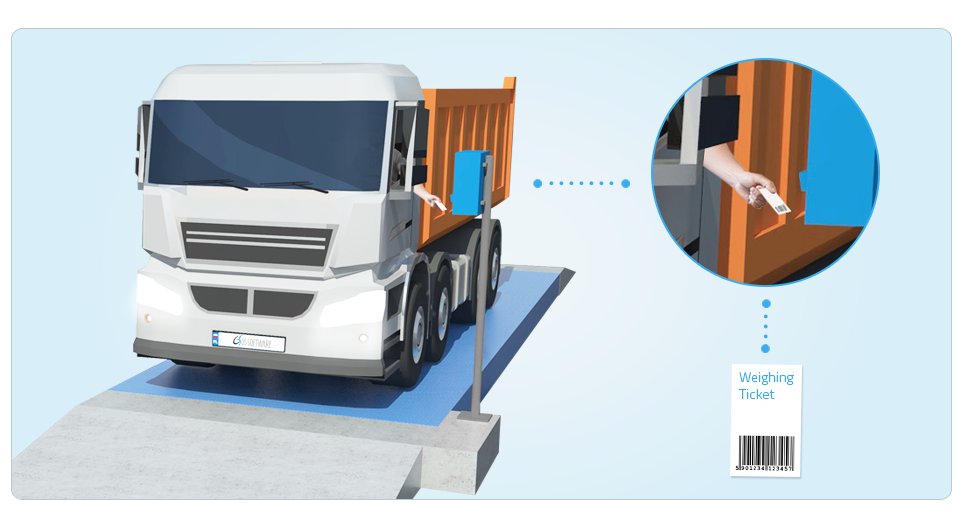 The first terminal is used to initiate the printing-out of a weighing ticket with a printed barcode, which is then taken by the driver. The terminal is equipped with an industrial printer of weighing tickets, protected with a cover, and a button to generate the printing-out process.