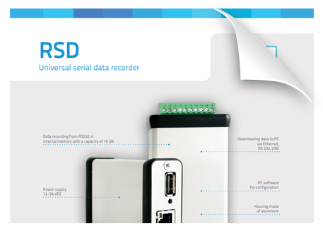 RSD to nowoczesne i proste urządzenie elektroniczne służące do rejestracji dowolnych danych pochodzących z portu szeregowego RS 232. Poprawny zapis ramki w pamięci urządzenia sygnalizowany jest poprzez zaświecenie diody lub wysterowanie wyjścia cyfrowego na czas określony w konfiguracji. Zapisane dane można zgrać na klucz USB lub do PC (poprzez Ethernet, RS232) a wyniki wyświetlić w oprogramowaniu, dołączonym w pakiecie razem z rejestratorem. Oprogramowanie umożliwia wyłuskiwanie danych z ramek transmisyjnych zapisywanych w pamięci (przykładowo: ramka zapisywanej transmisji posiada 32 bajty niemniej istotne dane znajdują się tylko na kilku bajtach).