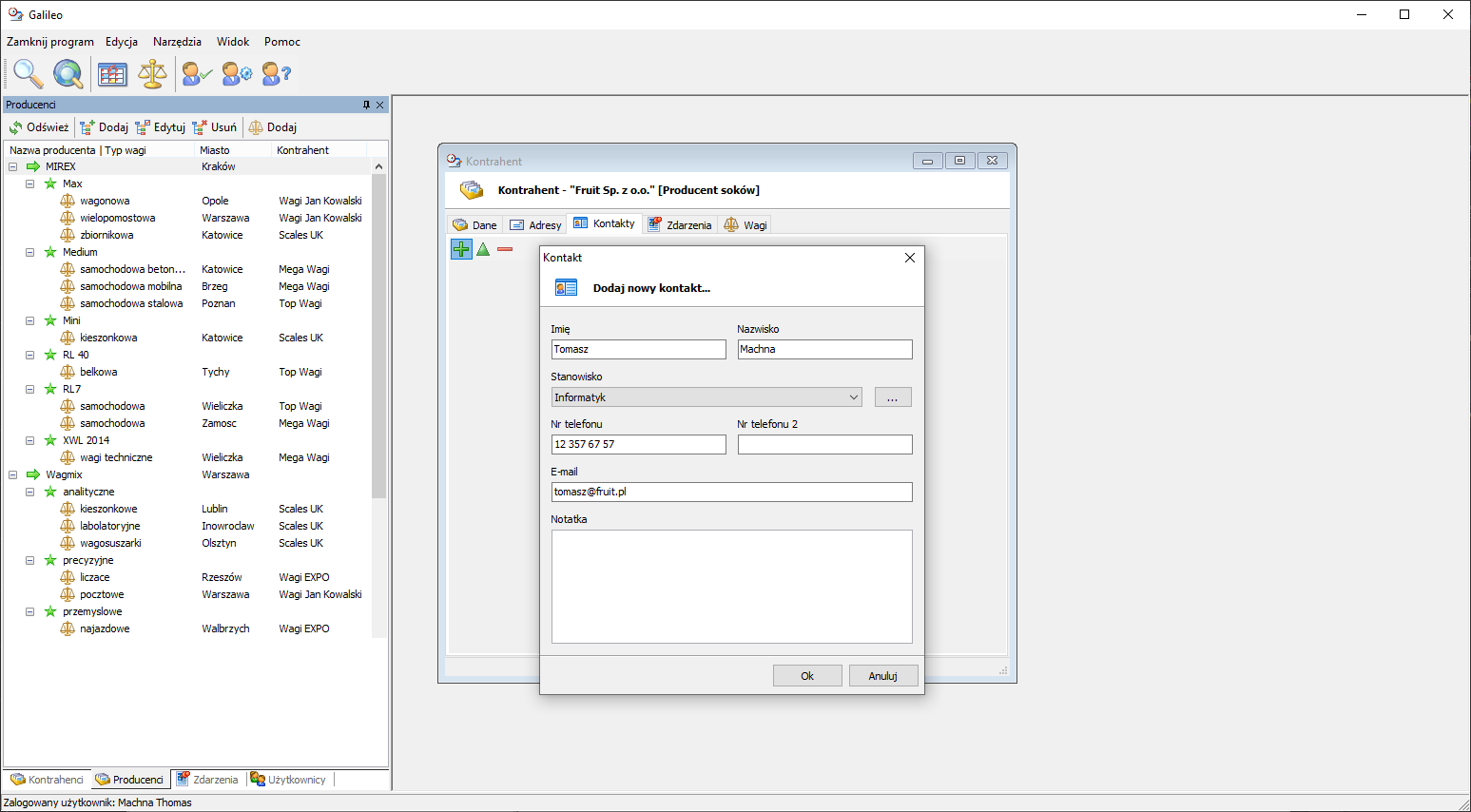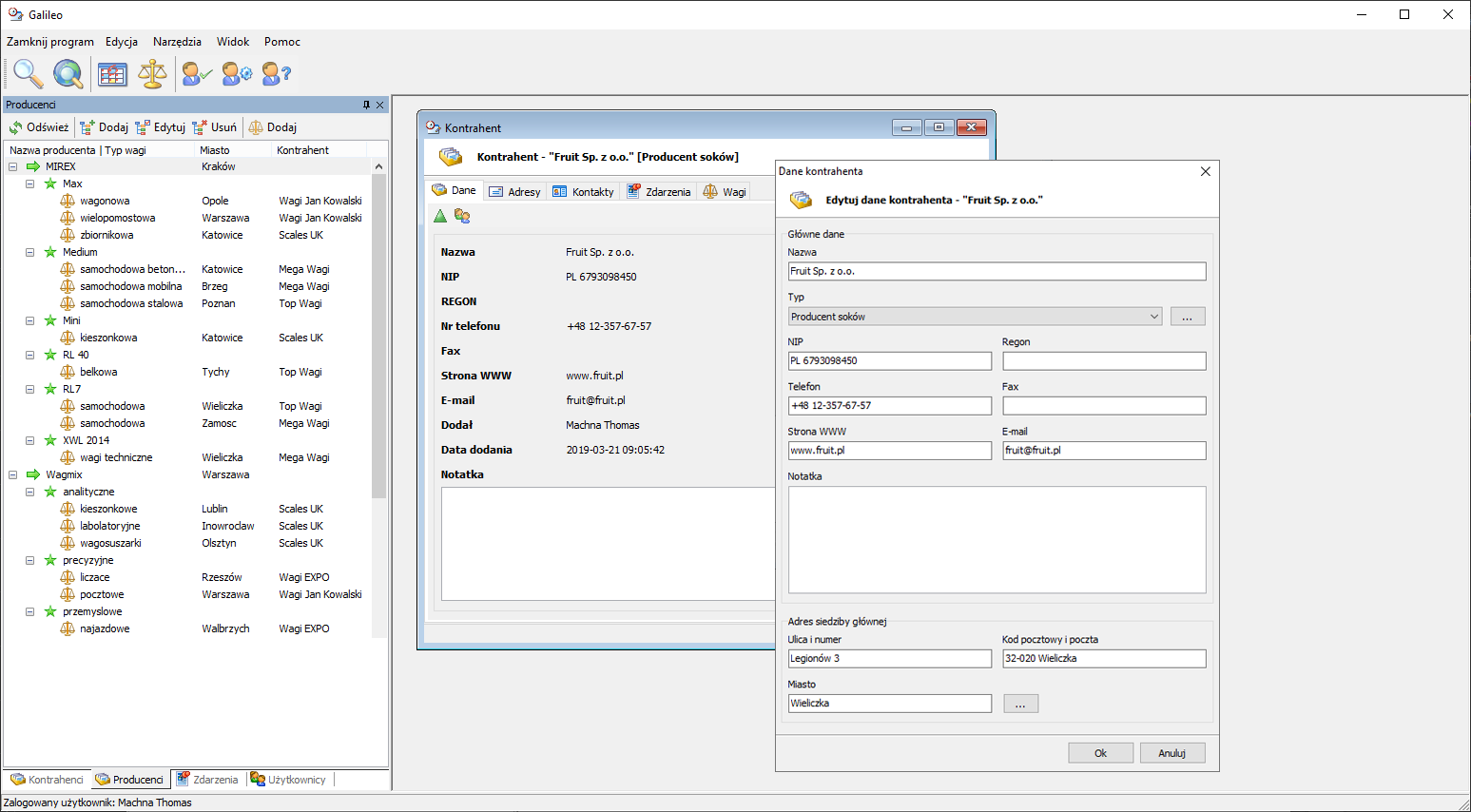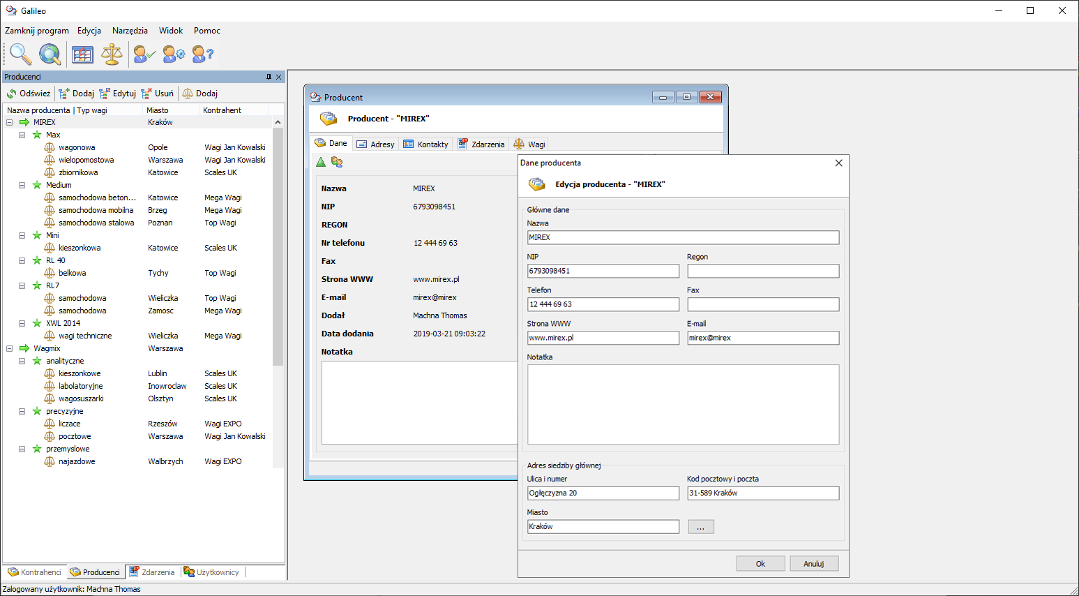 Do producenta wagi można również przypisać te same informacje, co do standardowego kontrahenta (adresy, kontakty, itp.).