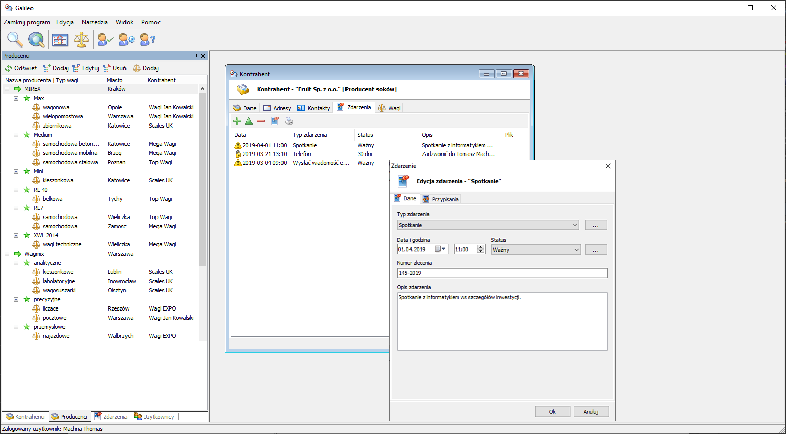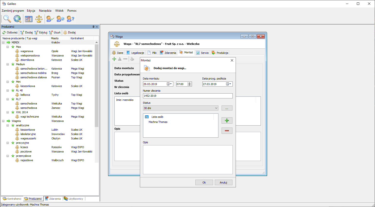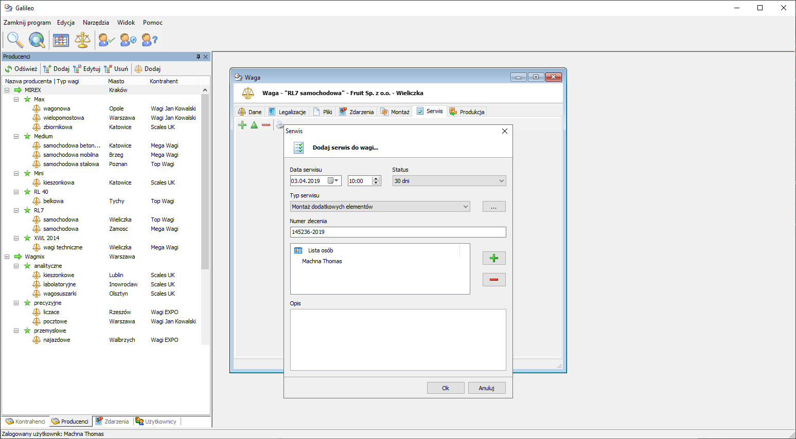 W programie Galileo każda waga posiada szereg szczegółowych parametrów. Program pozwala przypisać każdą wprowadzoną wagę do danego kontrahenta i producenta.