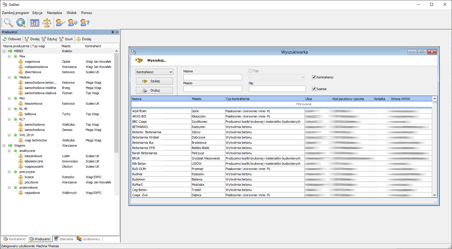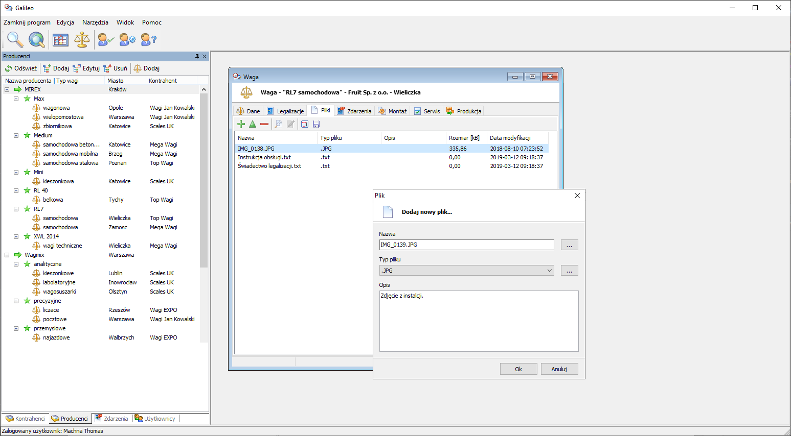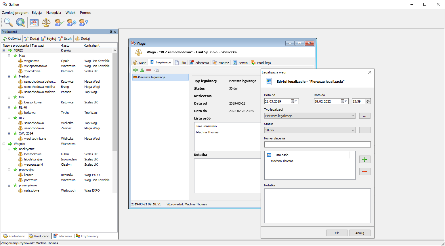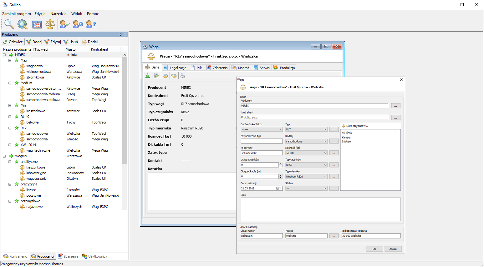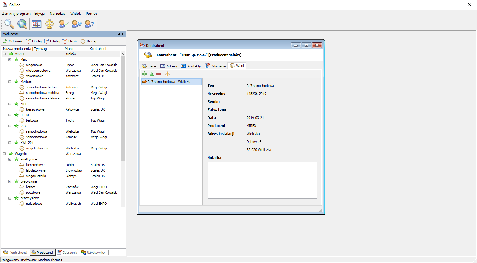 Galileo pozwala na tworzenie bazy zawierającej informacje o producentach wag. Do każdego producenta można dodać dowolną liczbę typów i rodzajów wag (np. paletowe, samochodowe itp). Takie rozgraniczenie umożliwia szybkie wyszukanie np. konkretnej ilości sprzedanych wag w danym przedziale czasowym lub w określonym regionie (np. w Małopolsce).
