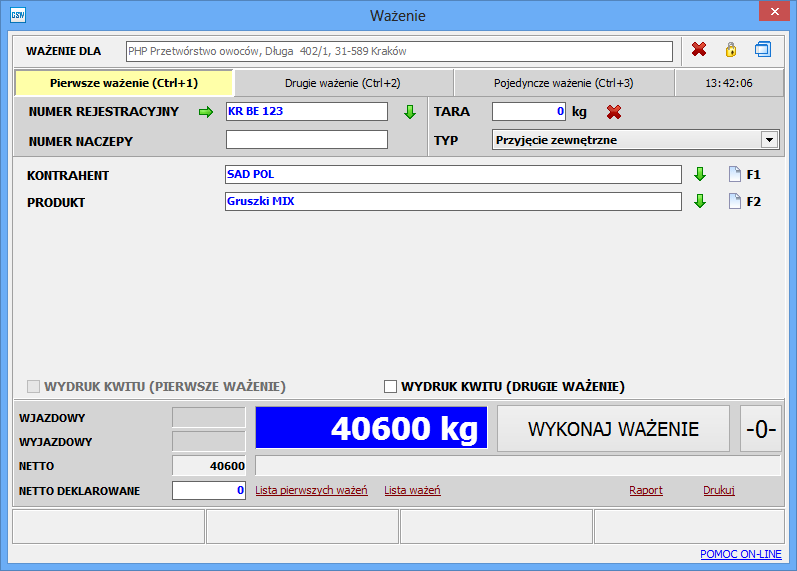 WAŻENIE PODWÓJNE Masa netto obliczana jest na podstawie różnicy dwóch ważeń : wjazdowego i wyjazdowego. Ważenie podwójne często nazywane jest ważeniem wjazd/wyjazd |