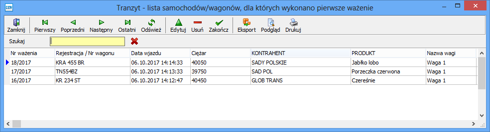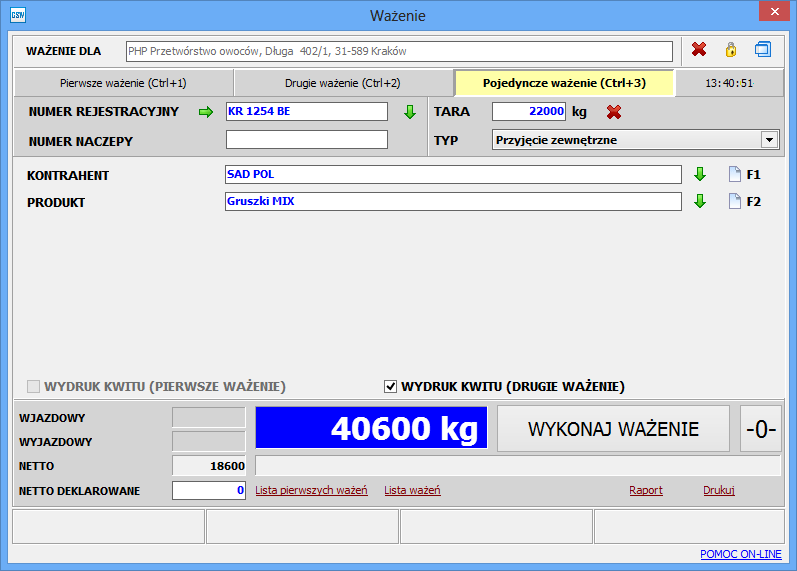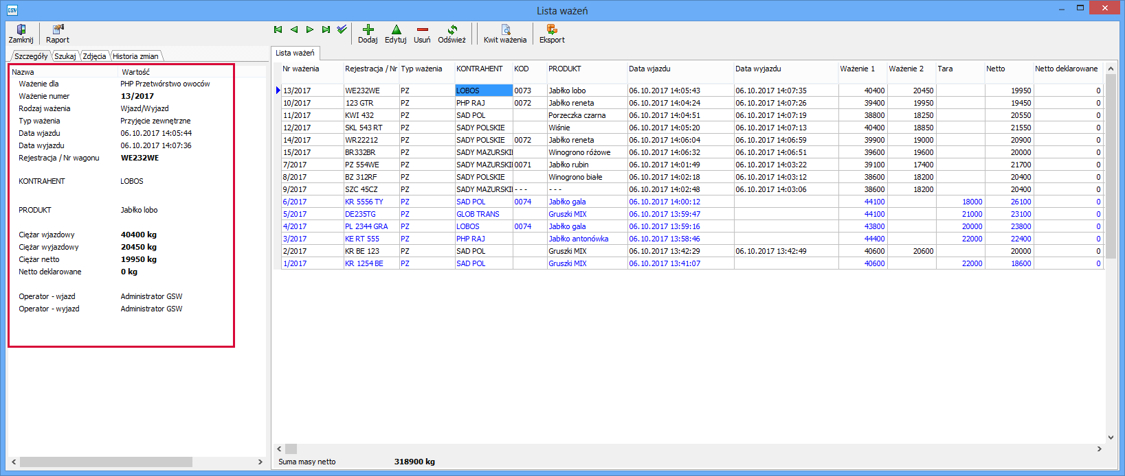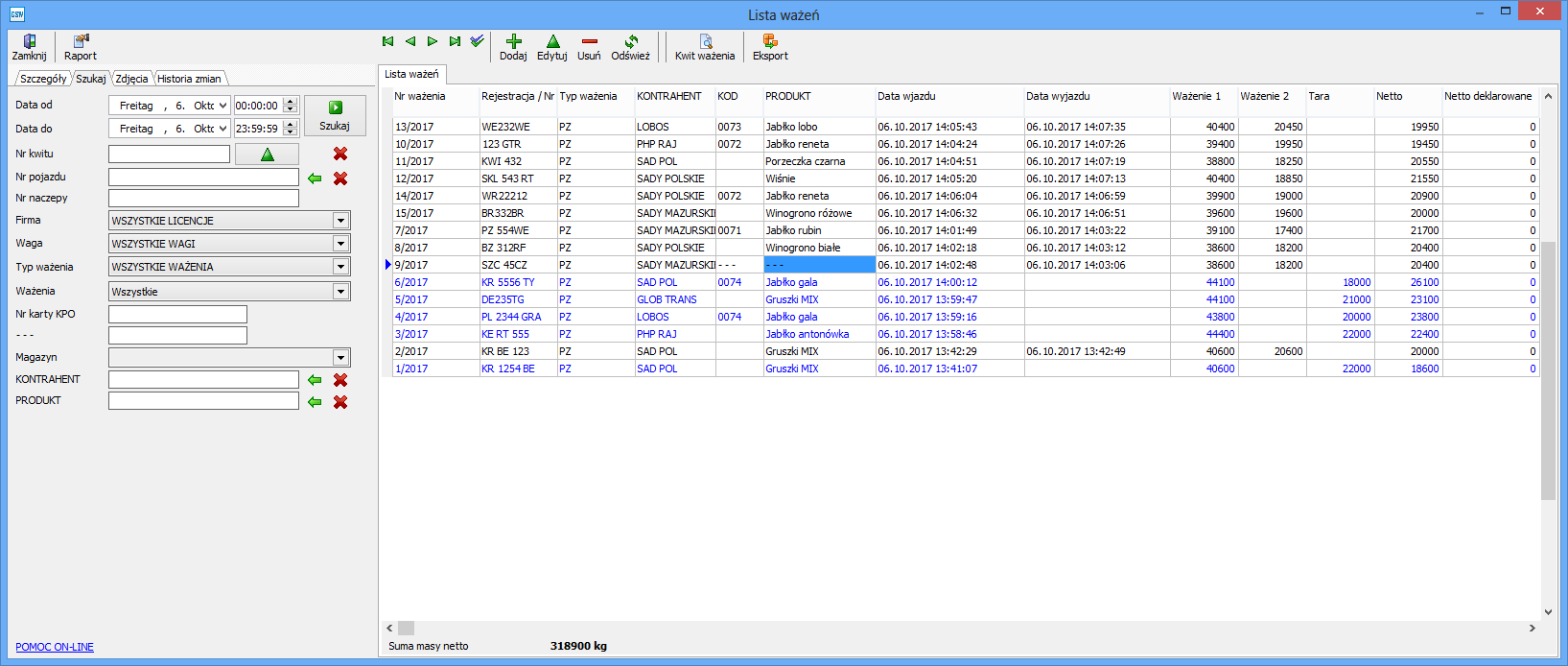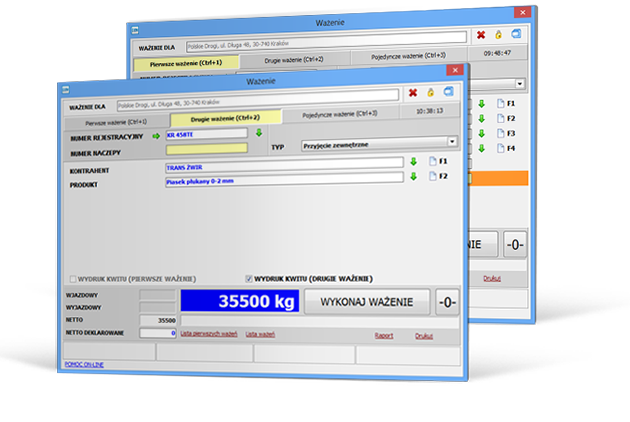 WAŻENIE NA WADZE Funkcja ta pozwala na wykonywanie ważeń na małych wagach (np. paletowych) bez konieczności podawania numeru rejestracyjnego. Wykonane ważenie będzie ważeniem pojedynczym. Funkcja ta często wykorzystywana jest w przedsiębiorstwach zajmujących się obrotem złomem stalowym. |