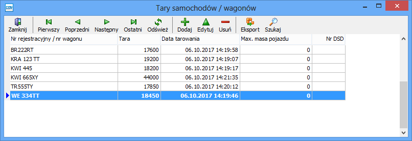 TAROWANIE Jest to jednokrotne ważenie pojazdu w wyniku, którego zważona masa zostaje zapisana w bazie danych programu GSW jako tara. Zapisane tary wykorzystywane są do wykonywania ważeń pojedynczych. |
