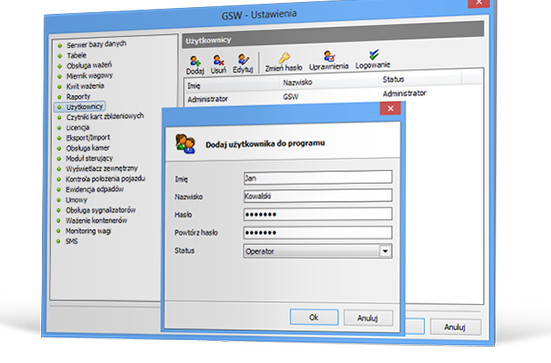 Program GSW posiada panel zarządzania użytkownikami programu.