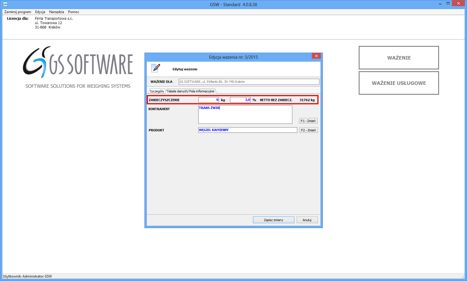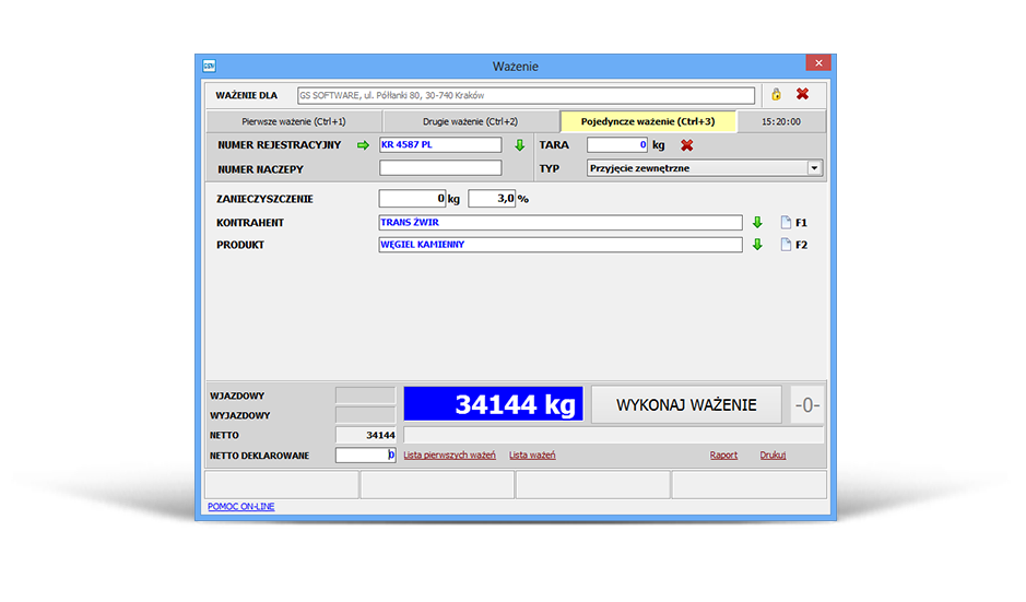 W oknie ważenia użytkownik określa czy zanieczyszczenie ma być wyrażone w procentach czy kilogramach oraz jaka jest jego wartość. Następnie program sam oblicza ile wynosi wartość ważenia pomniejszona o wartość zanieczyszczenia.