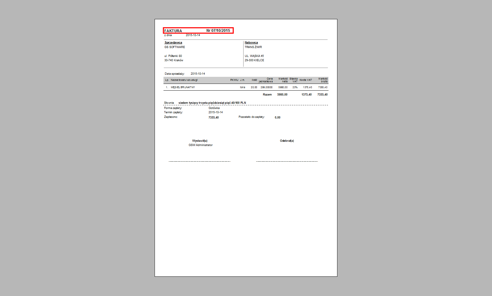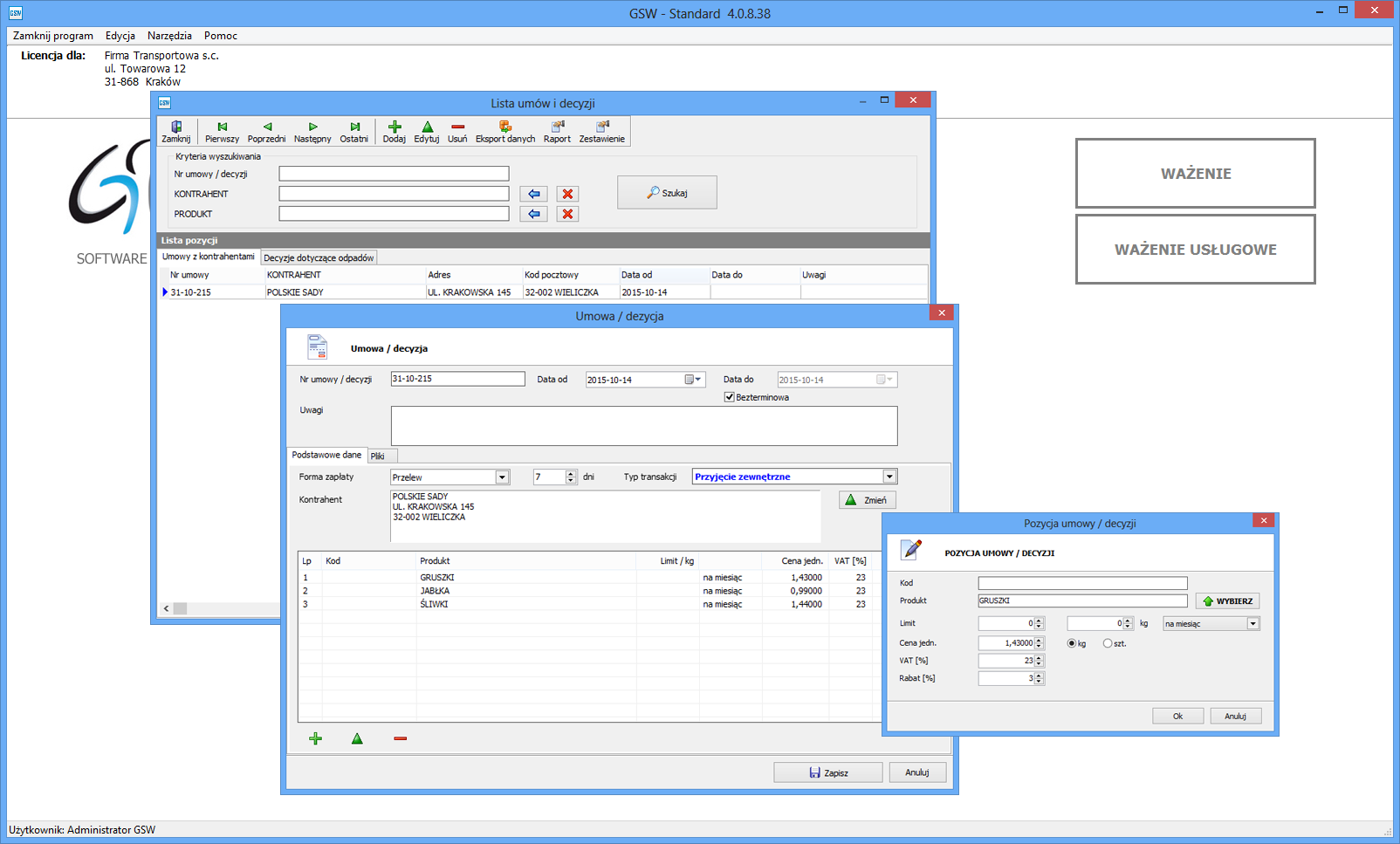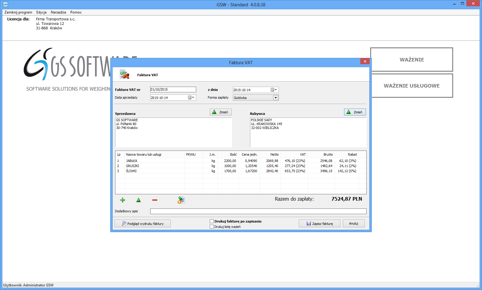 Program GSW można wyposażyć w dodatkowy moduł obsługi faktur. Moduł ten daje możliwość wystawienia faktury VAT tuż po wykonanym ważeniu. Wystawiając fakturę można uwzględnić m.in. rabaty przypisane do danego produktu lub kontrahenta.