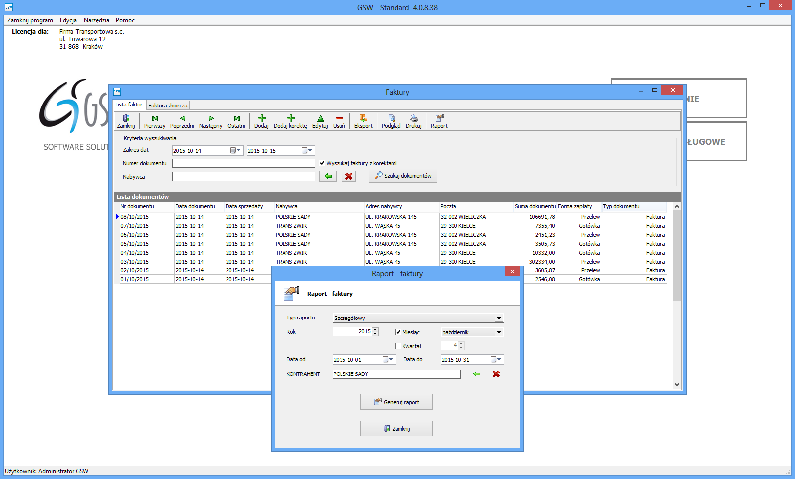 W programie GSW istnieje możliwość generowania raportów z wystawionych faktur. Istnieje możliwość wygenerowania raportu szczegółówego sumarycznego i sumarycznego za dany miesiąc.