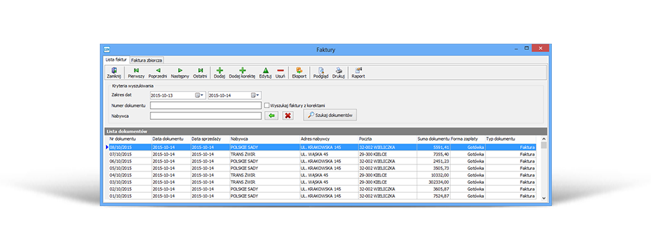 Z poziomu listy faktur użytkownik może przeglądać listę wystawionych dokumentów oraz je edytować. Ma możliwość dodania nowej faktury bądź też wygenerowania korekty faktury. Ma możliwość również zobaczenia podglądu wydruku faktury oraz podglądu duplikatu faktury. Z poziomu listy faktur może również stworzyć raporty.