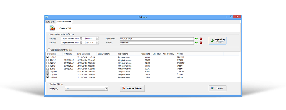 Istnieje możliwość wystawienia faktury zbiorczej dla danego kontrahenta lub produktu. Użytownik może sam zdecydowac które ważenia chce umieścić na danej fakturze zbiorczej