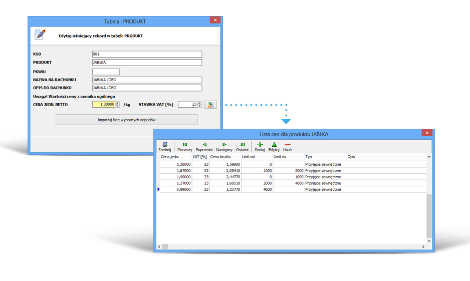 Do danego produktu można przypisać ceny. Ceny można wprowadzić też poprzez zakładkę umowy/decyzje.