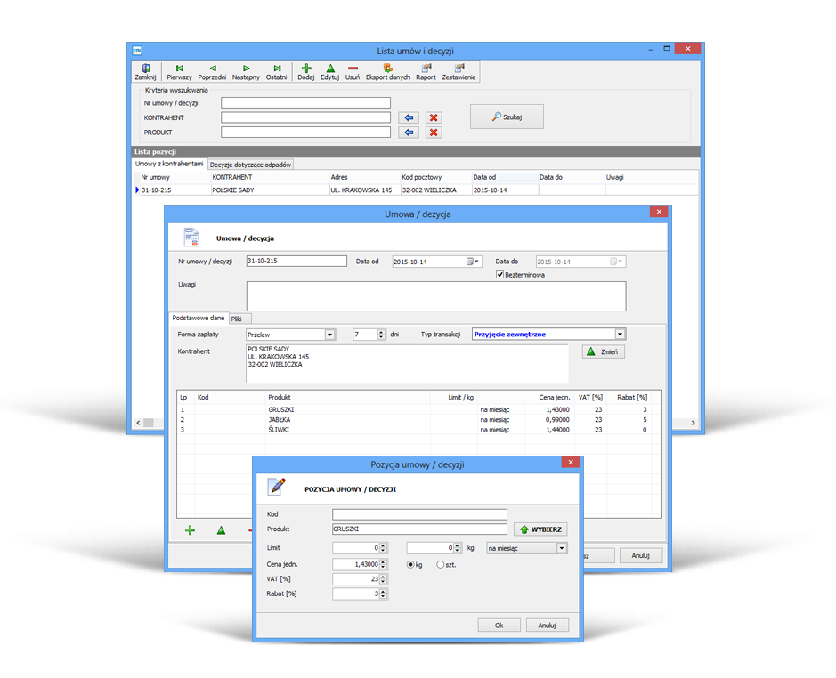 Można wprowadzić listę produktów które obejmuje dana umowa oraz szczegółowe dane takie jak: