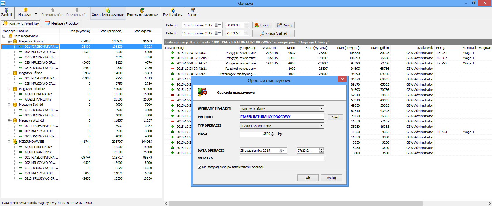 Operacje mogą dotyczyć dowolnego magazynu oraz produktu. Oprócz określenia typu operacji można także podać masę, datę oraz dodatkowe uwagi.
