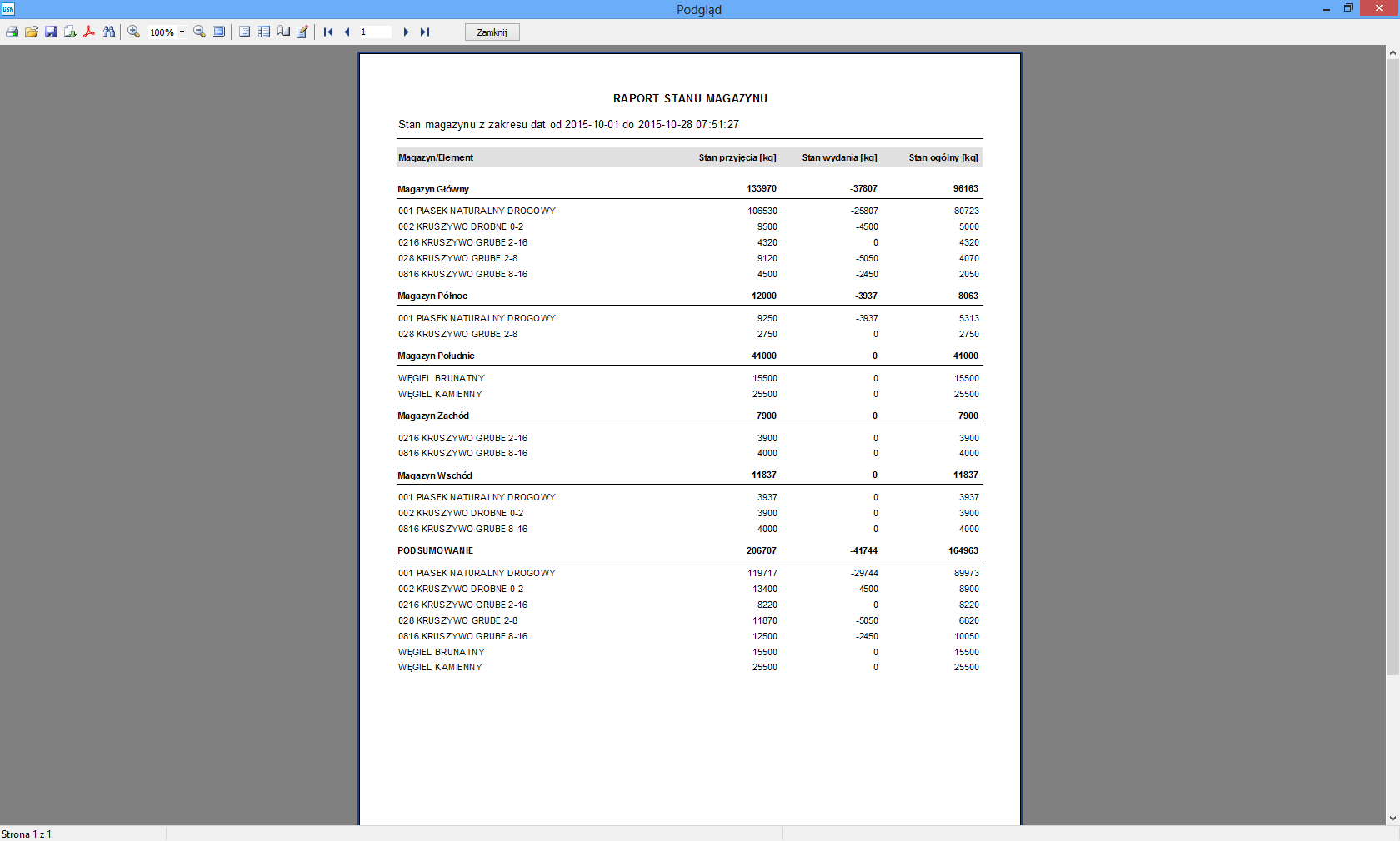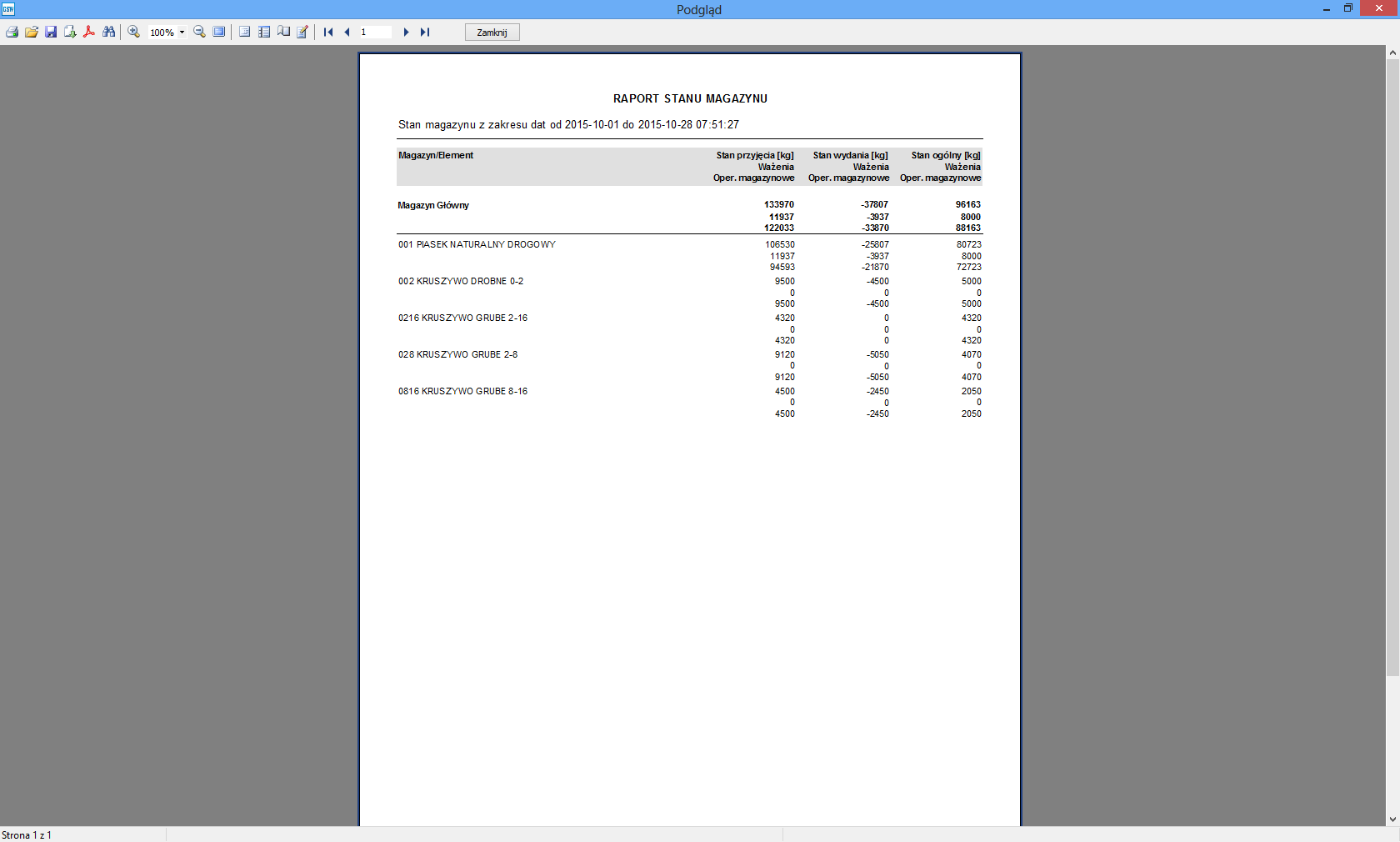 W module obsługi magazynu istnieje też możliwość stworzenia raportów ze stanów magazynowych. Raporty mogą dotyczyć wszystkich magazynów lub tylko wybranego. Użytkownik może określić szczegółowe parametry, które mają być widoczne na raporcie.