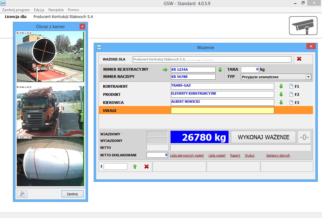 GSW może jednocześnie obsługiwać aż 12 kamer (4 kamery na wagę). Przez cały czas działania programu operator wagi widzi podgląd kamer online. Zdjęcia przypisywane są do ważeń w momencie zatwierdzenia ważenia.