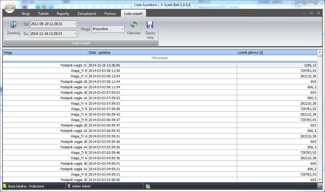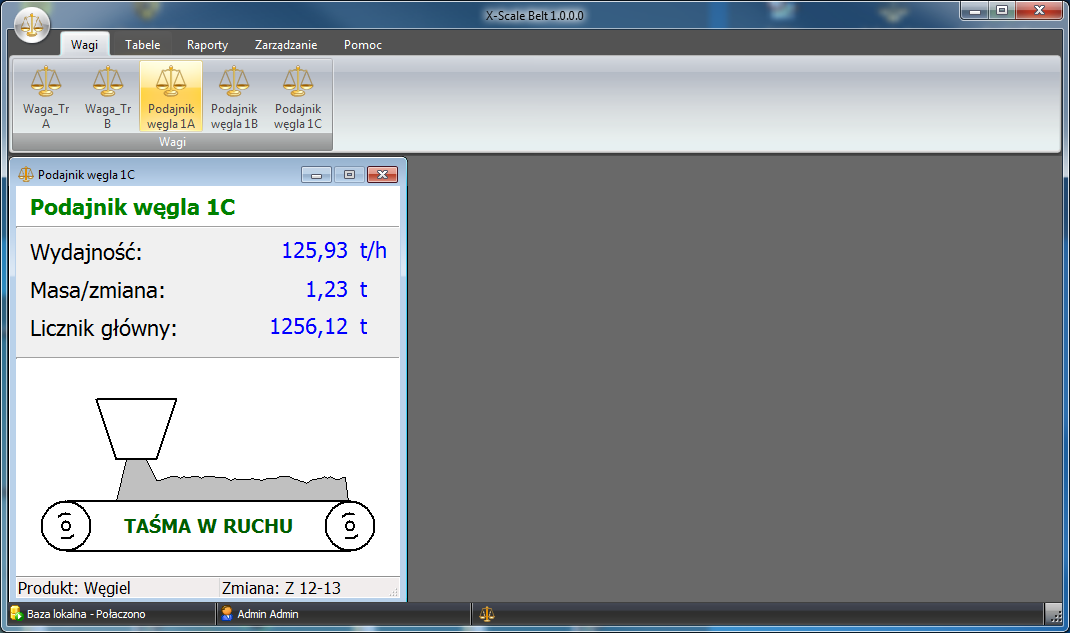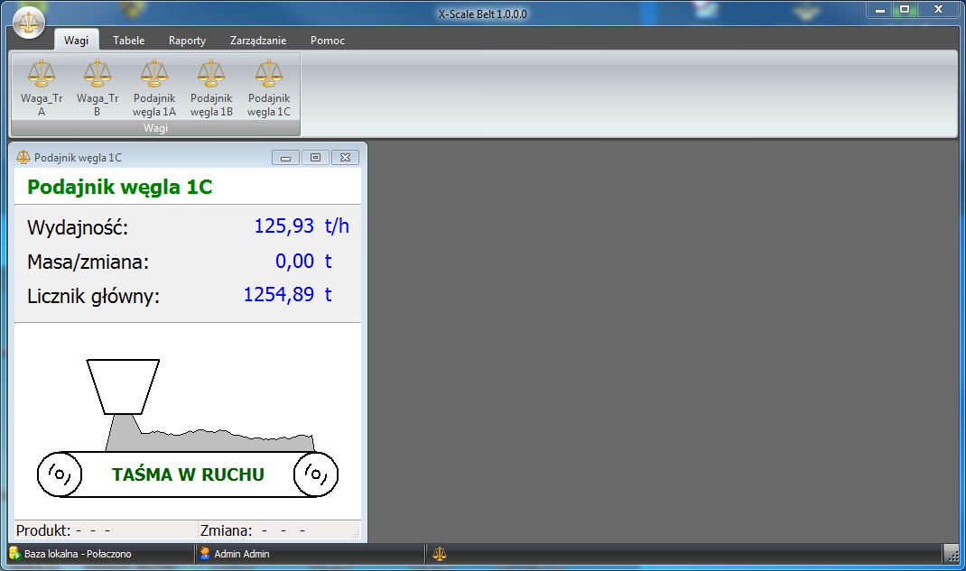 Program X-Scale Belt może jednocześnie gromadzić pomiary z dowolnie wielu wag przenośnikowych. Każda z wag może być innego typu (inny miernik wagowy) oraz pracować w innym trybie zmianowym.